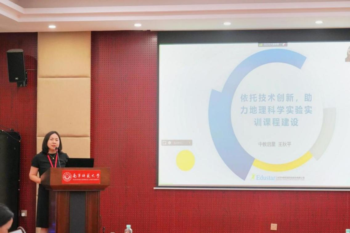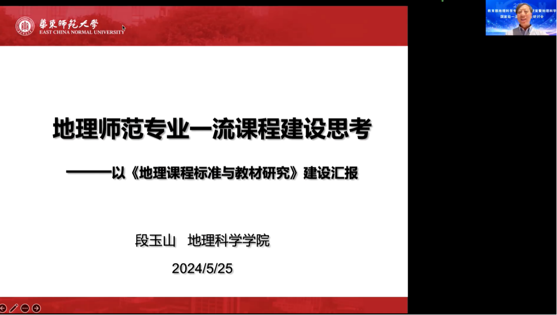 在国家一流课程建设方面,华东师范大学国家地理教材建设重点研究基地主任段玉山教授线上做了《地理师范专业一流课程建设思考》的报告,华中师范大学城市与环境科学学院李家清教授线上做了《地理科学专业(师范)教师教育课程群建设:理路与方法》的报告;北京中教启星科技股份有限公司王秋平教研总监做了《依托技术创新,助力地理科学实验实训课程建设》的报告。