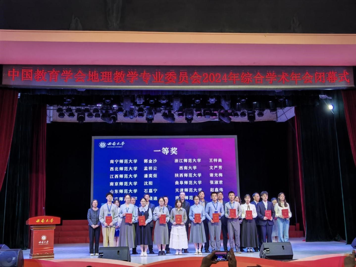 本届全国“田家炳杯”全日制教育硕士专业学位研究生学科教学(地理)方向教学技能大赛由中国教育学会地理教学专业委员会主办,西南大学承办,分为初赛和决赛两个阶段。初赛采取线上形式进行,竞赛内容包括教学设计、教学视频两项内容。共有来自北京师范大学、华东师范大学、华中师范大学、南京师范大学等66所高校的262名选手参加初赛,经过初赛评审,共计131名选手入围最终现场决赛,决赛入围率为50%。决赛的获奖比例为一等奖10%、二等奖20%、三等奖40%,经过激烈角逐,最终产生一等奖13名、二等奖26名、三等奖52名、优秀设计奖37名。