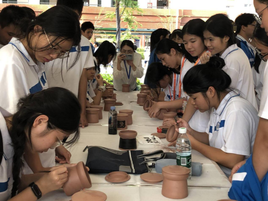 (图/实习教师黄小协助记录学生体验坭兴陶过程)