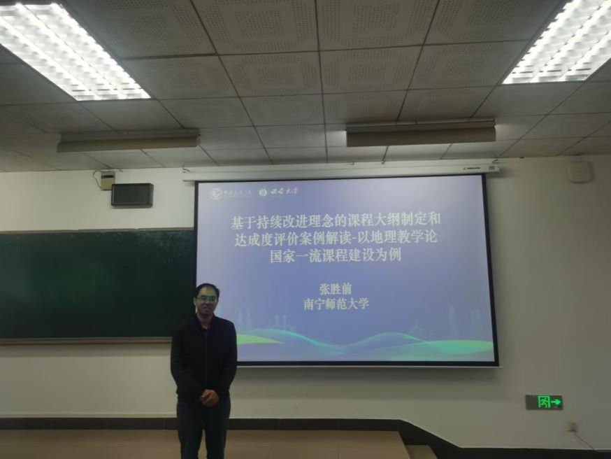 会上,我校张胜前教授在“地理教学模式创新与地理课程发展”第三分会场做了题为“基于持续改进理念的课程大纲制定和达成度评价案例解读——以地理教学论国家一流课程建设为例”的专题交流,分享了教学大纲的功能、教学大纲制定的核心要素和课程教学大纲达成评价的主要路径和课程达成报告的撰写等内容。此外,张胜前教授还参与了10月28日下午召开的“中学地理课”育人价值的专题论坛。