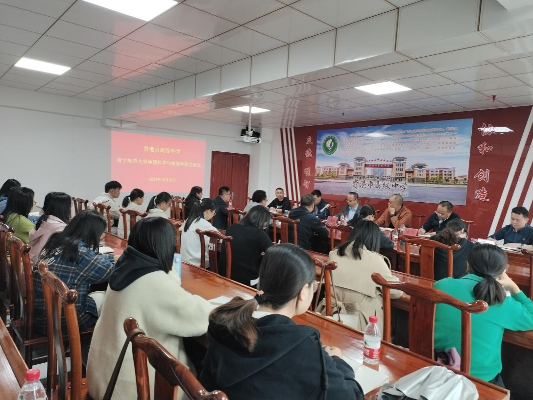 2024年10月29日上午,在贵港市高级中学汇德楼10楼1005会议室开展贵港市高级中学与南宁师范大学必威西汉姆联交流会。会议由贵港市高级中学杨奕宁副校长主持,必威西汉姆联严志强书记、盛凯副书记、刘立昌副教授、全体地理实习老师以及贵港市高级中学陆卓纯校长、杨奕宁副校长、姜攀主任、包春梅主任、杨晟彬主任、郑耀亮主任等人参加。会议议程主要是五个部分:杨奕宁副校长致欢迎词,实习生代表发言,姜攀主任汇报地理实习生实习情况,严志强书记发言,陆卓纯校长总结发言。