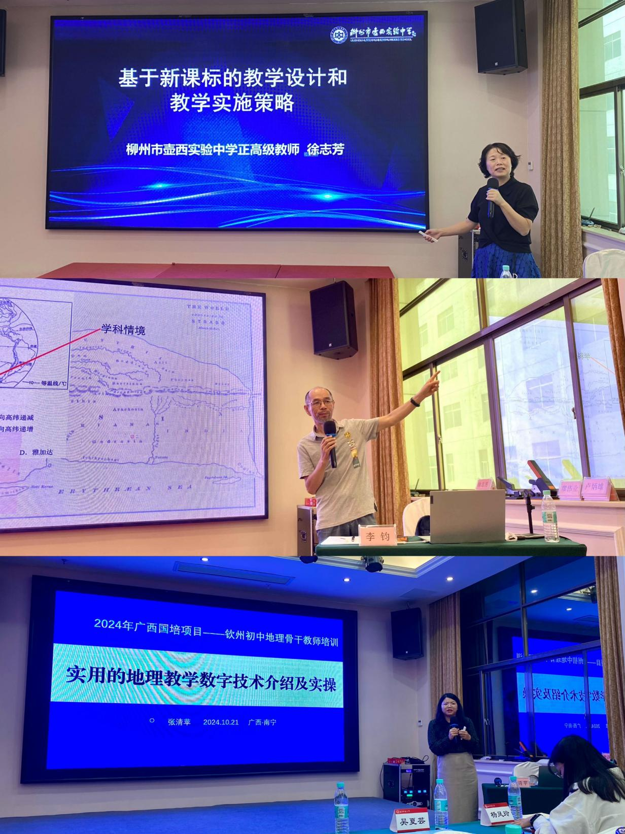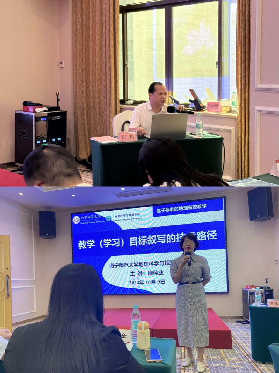 集中培训阶段,钦州市委教育工委专职副书记陆杉、南宁师范大学廖伟业副教授、柳州市壶西实验中学党委书记徐志芳、南宁市教育科学研究所高级教师李均、南宁市邕宁高级中学一级教师、科研处主任张清苹等专家为学员们带来了精彩讲座,并与学员们进行了热烈交流与讨论。讲座围绕“做一名德才兼备的优秀地理教师”“新课标背景下教学目标叙写的技术路径”“基于新课标的教学设计和教学实施策略”“基于问题解决的初中地理教学”“实用的地理教学技术工具介绍”等专题,帮助学员提高师德水平、重视地理核心素养、提升教研能力、加强命题能力、更新教育观念、转变教育行为、增强地理信息技术运用能力,增进对义务教育课程标准的理解、进一步了解当前义务教育改革发展的最新动态和趋势,促进教师专业成长。