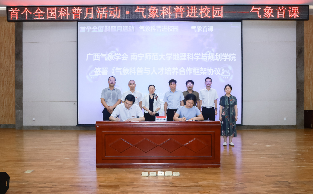 “气象首课”活动精彩纷呈,我校副校长龙妮娜出席活动并致欢迎词,自治区气象局副局长全文杰以“气象科学发展历史与适应AI时代的思考”为题为广大师生讲授“气象首课”。期间,南宁师范大学与广西区气象局共同签署了《气象科普与人才培养合作协议》,学生代表宣读了《气象科普志愿者倡议书》。“气象首课”活动的顺利举办,引发了在座同学的强烈共鸣,为我校大气科学专业2025级新生明确了学业发展方向。同学们纷纷表示,将在未来的学习生活中,夯实专业基础,为建设气象强国、实现中华民族伟大复兴贡献青春力量。