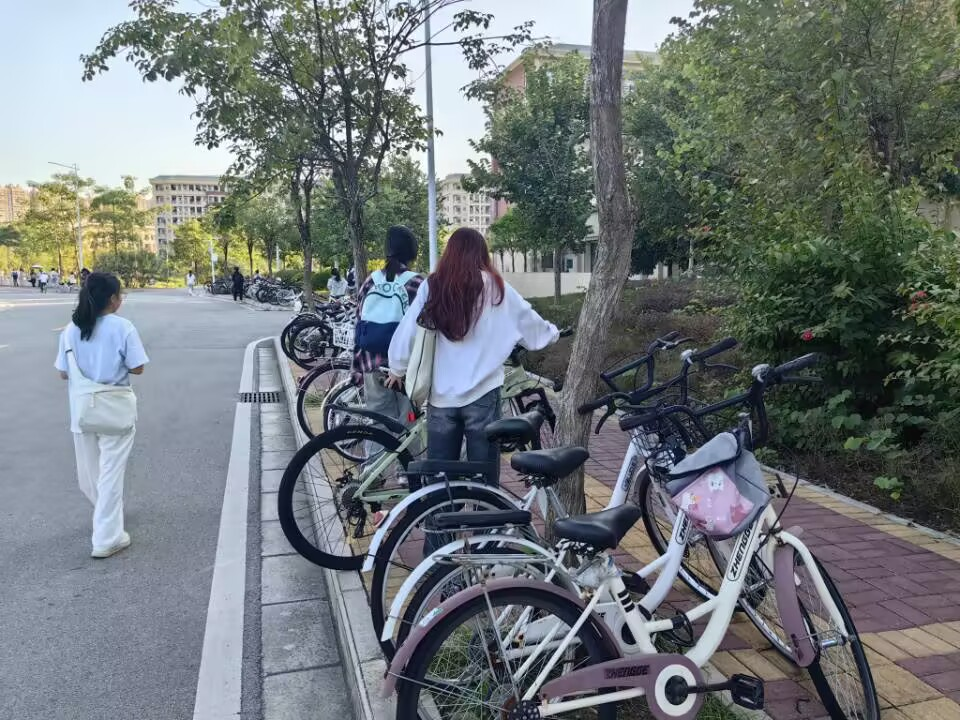 (同学们在实验二号教学楼摆放自行车)