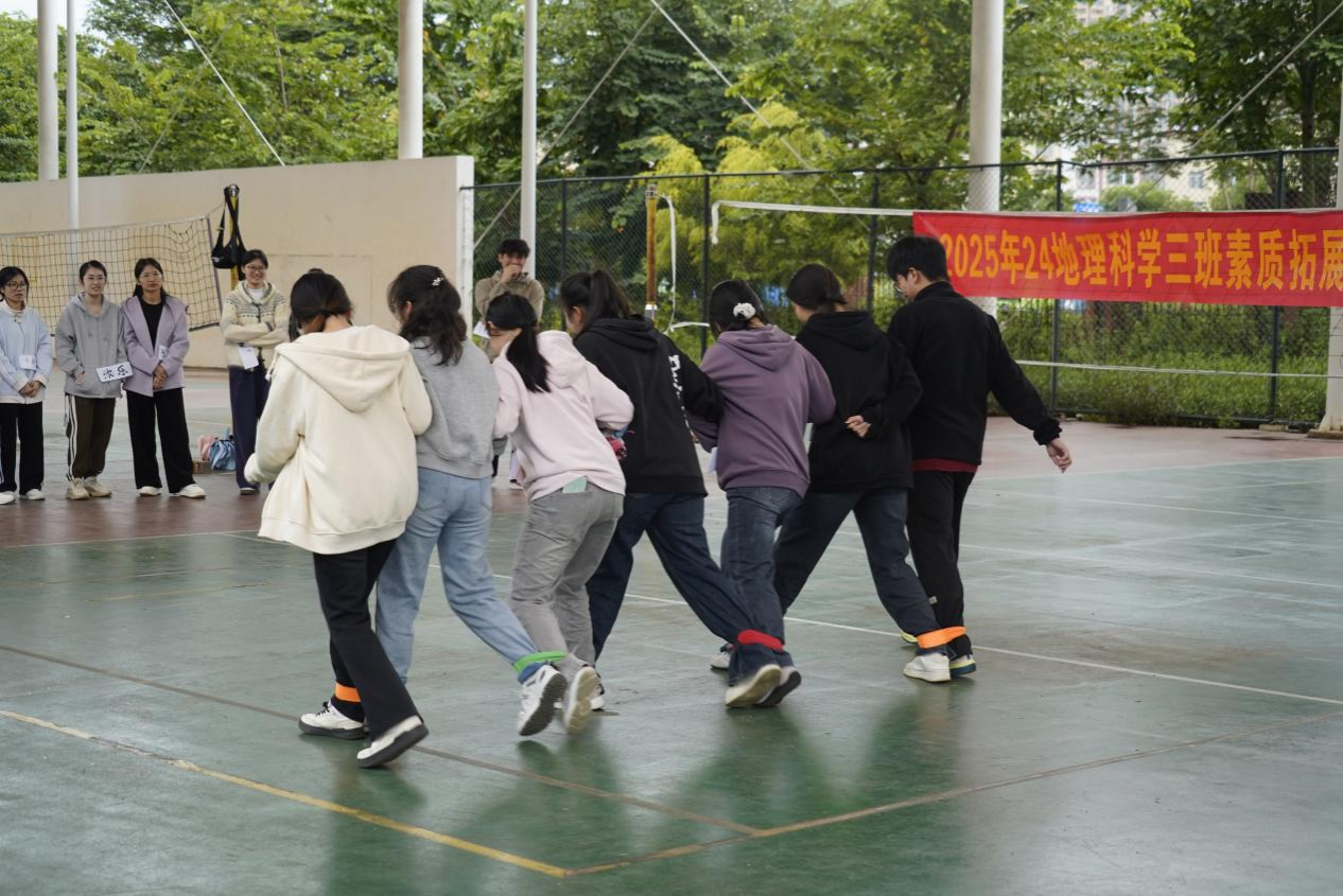 活动当天,2024级地科三班班主任覃辰柳主持开场并讲解了 “一圈到底”“七人八足”“气球运球”等趣味游戏的规则。活动开始后,同学们组队参与,在比赛中默契配合、互相鼓励,现场掌声与欢笑声不断。轻松的素质拓展活动,为校园生活添趣减压,增进同学间的了解与信任,让班级氛围和谐融洽,凝聚起团结友爱的力量。