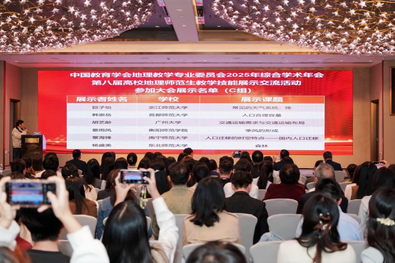 23—26日,我校地理师生代表还参加了学术年会的其他多项活动。其中23日下午的“全国高师地理学术探讨”,聚焦师范院校地理专业的改革与创新,为地理学科优化人才培养方案、强化师范特色提供了宝贵思路,其中“人工智能赋能地理教学”的专题报告,揭示了AI技术重塑未来课堂的无限可能,为未来我校地理教学改革与科研注入新动能;24日上午的学术年会开幕式与大会特邀报告,介绍了地理学科发展和地理教育研究的最新前沿与未来趋势。24下午的“中学地理教师教学交流展示”,通过走进真实课堂,观摩一线名师如何将理论转化为实践,让大家对“如何上好一堂地理课”有了更直观、更深刻的理解,也切身感受到了教学一线的活力与挑战。25日的“第二届地理教材建设与研究高峰论坛”,围绕教材的编写理念、内容创新与使用策略展开,深化了教师对国家课程资源核心载体的认识,对提升教材分析与运用能力具有重要价值。在学术年会的闭幕式上,学生代表上台获颁展示活动证明。