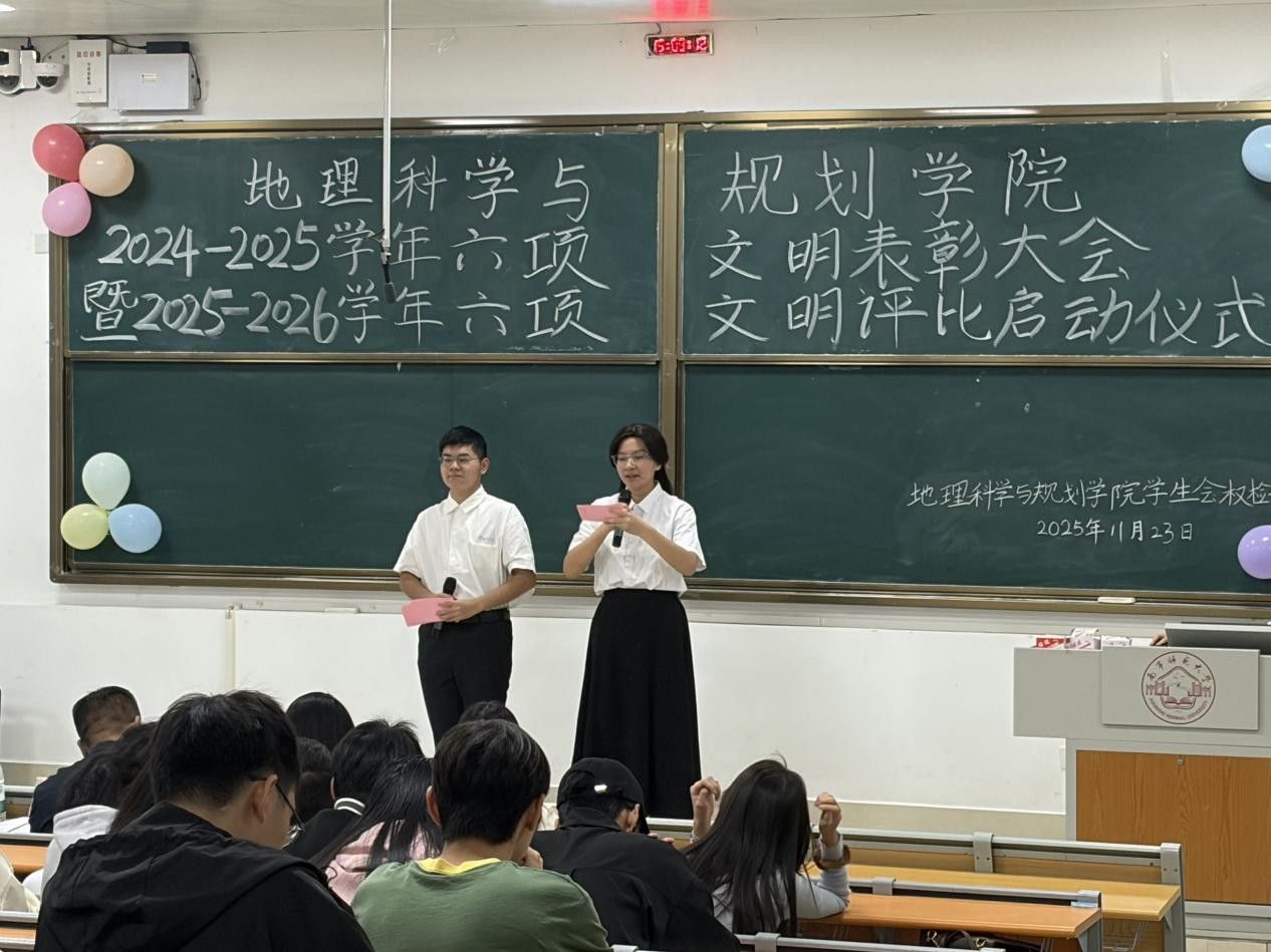 致辞结束后,大会进入表彰环节。在过去一学年里,学院涌现出一批在文明创建工作中突出的先进集体,这些集体立足自身、示范引领,充分展现了地理学院学子的良好精神风貌。学院兼职辅导员黄小为获奖代表颁发荣誉证书,并勉励大家珍惜荣誉,再接再厉,持续发挥模范带头作用。仪式最后,大会正式启动了2025-2026学年“六项文明”评比工作,激励全院师生见贤思齐,主动践行文明规范,将文明修养内化于心、外化于行。