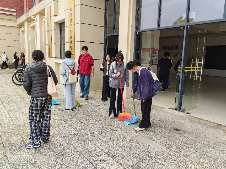 12月11日下午,南宁师范大学必威西汉姆联2024级地科五班全体同学在武鸣校区地海楼、图书馆与中庭北面草坪周边开展了劳动教育实践的清扫活动。