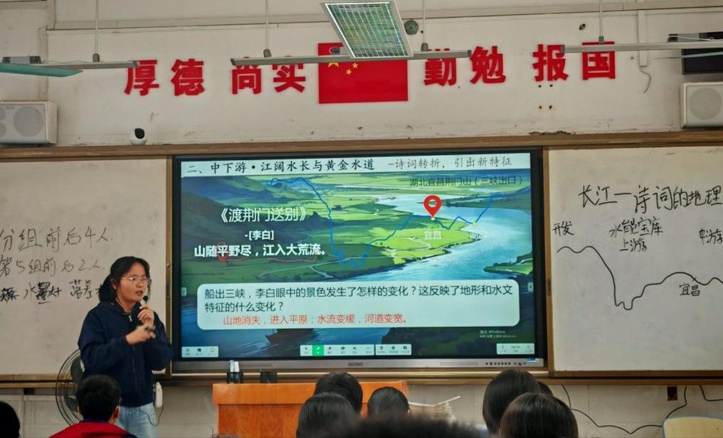 实习教师谢学丹的课堂则独具匠心,以诗词为引、以情境为桥,生动勾勒出长江上中下游的不同地理特点,让学生在诗意氛围中感知地理之美。她在自评中特别反思了课堂时间把控方面的问题,因课程内容较为丰富,且课堂讨论环节耗时超出预期,最终导致课程未能按时结束,一定程度上影响了教学节奏的完整性。指导老师张九菊则对其课堂亮点给予肯定,尤其表扬了两方面优势:一是讨论环节引导词设计精妙,衔接自然且极具启发性;二是讨论问题难度设置精准适配学生认知水平,有效激发了学生的探究热情。同时,张九菊老师结合本节课出现的不科学用语现象,向全体实习老师着重强调:授课过程中需高度重视科学用语的规范性,严格规避不严谨表述,以保障地理知识传递的精准性与专业性。