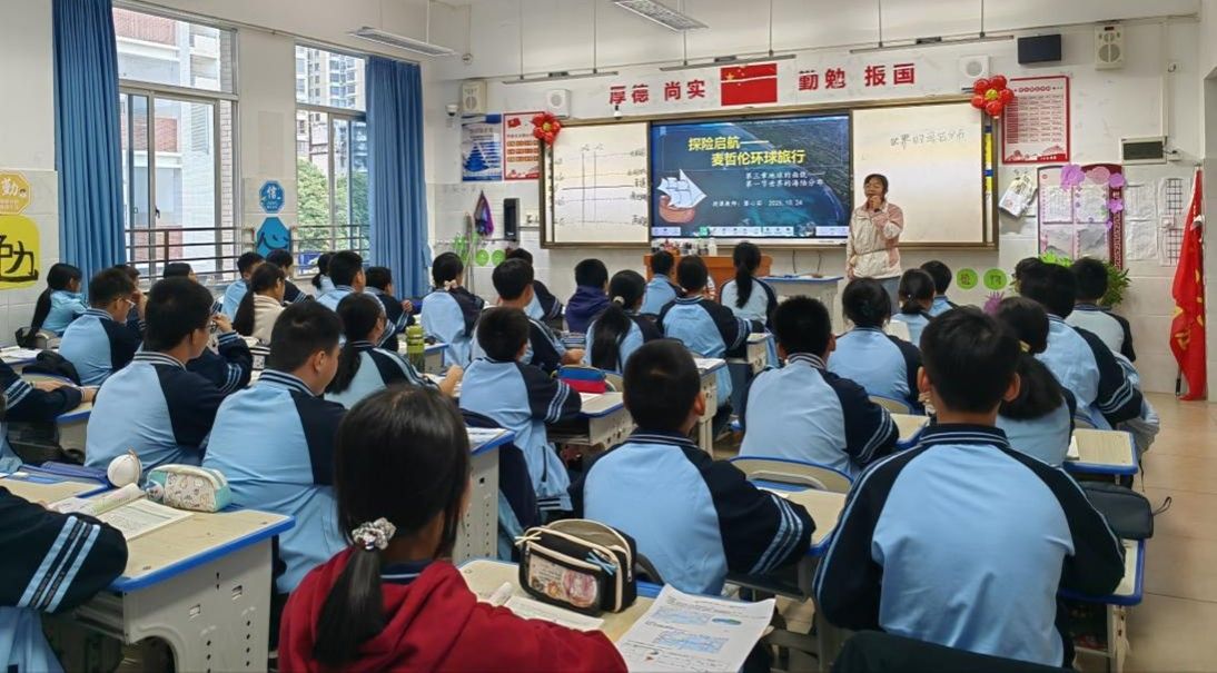 在课堂教学展示中,实习教师黎心茹以“麦哲伦环球航行”为情境主线,巧妙串联教学内容,引领学生沉浸式探究世界海陆分布的奥秘。其教学设计逻辑严谨、层次分明,各教学环节过渡自然流畅,衔接紧密;课堂互动更是生动有趣,既充分调动了学生的参与热情,又兼顾知识理解与能力培养,让学生在交流探讨中深化地理认知,提升地理思维能力。课后,黎心茹在自评中表示,尽管本节课整体逻辑较为顺畅,实施过程中师生配合默契、节奏把控得当,但未预留充足时间供学生梳理笔记,导致课堂节奏略显仓促,部分学生难以同步消化知识点。指导老师张九菊高度肯定黎心茹的授课表现,同时也表示,本节课在师生课堂活动方面有较大的改进空间,希望黎心茹及实习小组其他成员吸取教训、加以改进。