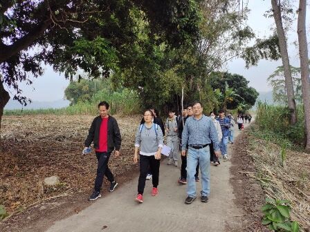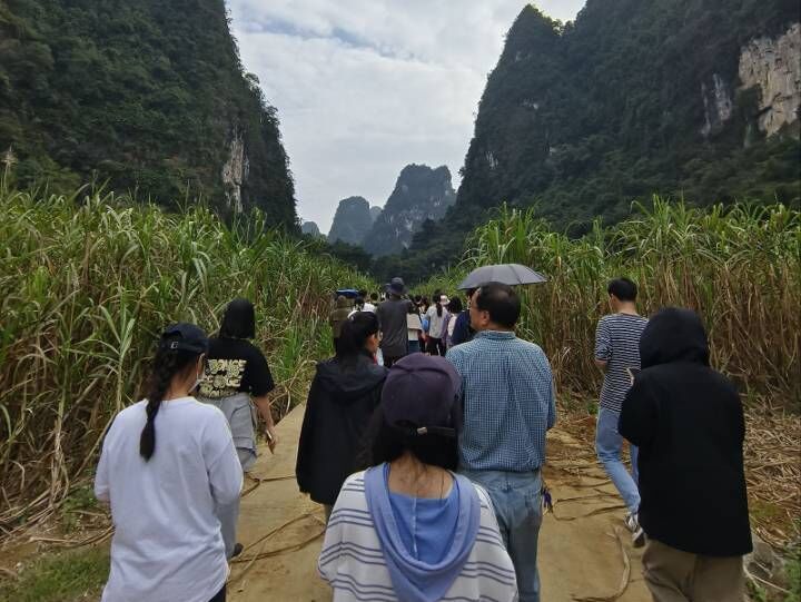 沿着道路行进,两旁是丰收的甘蔗和劳作的农民,远处是层峦叠嶂的山影,林清老师为同学们讲述河流阶地的成因;同学们好学的询问着秦年秀老师各种植物;曾长育老师给同学们介绍喀斯特地貌的类型与演化过程。师生一起畅谈见闻,同学们收获满满、喜笑颜开。