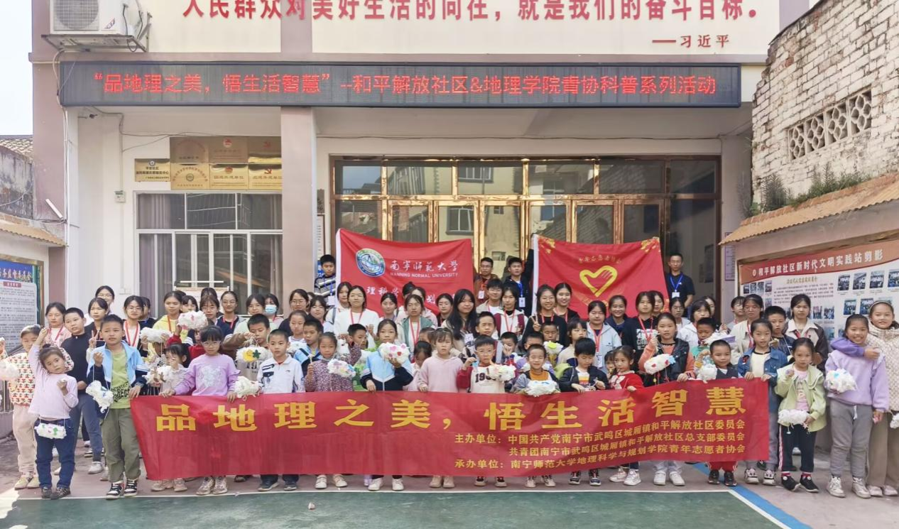 为让大学生提升思想、修身养性,树立服务社会的思想,必威西汉姆联青年志愿者协会于2023年12月9日前往南宁市武鸣区城厢镇和平解放社区开展以“品地理之美,悟生活智慧”为主题的第四期社区科普活动。