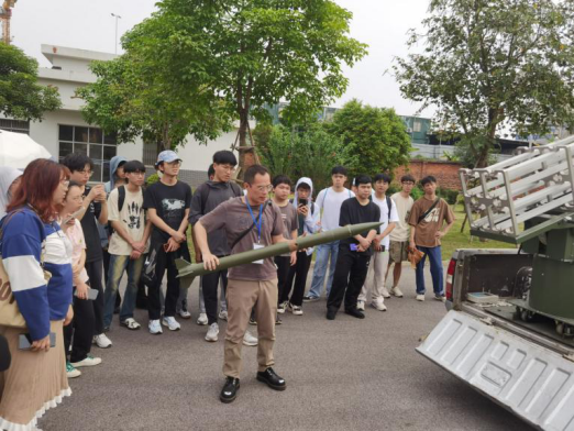 “风以动气,雨以润时。”风可吹动气流,雨可以滋润万物,展现了气象对于生态环境的重要性。同学们首先来到了广西人工影响天气基地,参观指挥中心与陈列室以及人影科普园,详细了解到高炮、火箭车等在增雨、增雪、防雹等业务中的功能及应用案例,以及人工影响天气的基本原理与方法等多样内容。在基地老师的指导下,同学们亲手体验人工增雨作业装备的规范化操作流程,深入感受到一线业务人员的严谨和辛勤。