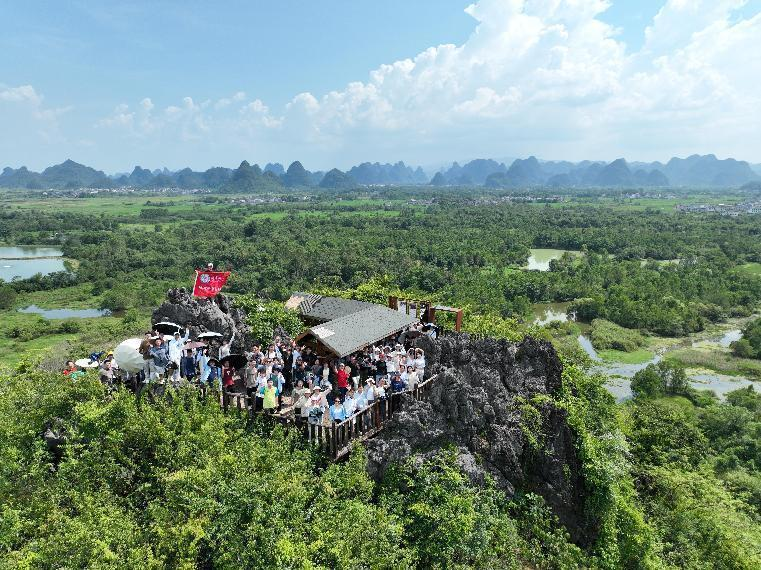 在实习期间,师生们还探访了多处喀斯特地貌景观,系统了解了地上喀斯特和地下喀斯特的成因和特点。9月4日下午,一行人来到南边村国际D/C界线地质遗址保护区,发现了众多古生物化石,了解了泥盆纪与石炭纪的地层界线及其在国际地质科学界的重要地位。9月6日上午,师生们寻访了漓江源大峡谷,深入调查了漓江源地貌的形成过程,探讨了峡谷区毛竹与周边大尺度区域的环境差异对该地生态系统、当地居民的影响,以及源头水的开发和保护现状。9月8日下午,在阳朔县兴坪镇境内的幸福源水库双线特大桥上,师生们就两侧山峰呈现出的截然不同特征进行了现场讨论,分析了该岩溶区喀斯特地貌“同时异态”的形成过程。9月3日下午,实习队伍首先来到了桂林市临桂区的会仙喀斯特国家湿地公园,同学们在小组汇报后,带着梁浩原老师提出的问题——为什么喀斯特地区通常保水难,而会仙这里却能形成湿地——在乘船和爬山途中寻找答案,这一过程不仅加强了同学们对地质地貌知识的理解与运用,还树立了保护环境的意识。