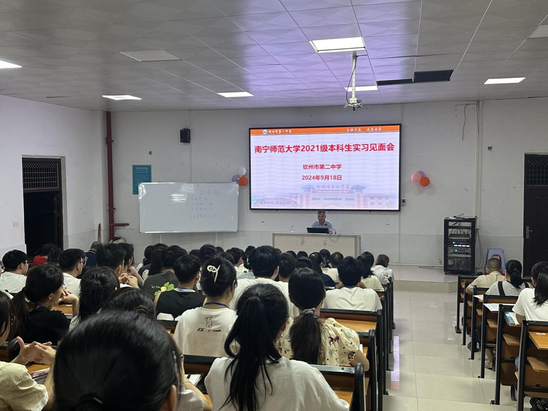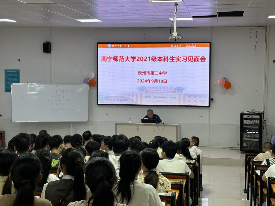 步入学习气氛浓厚的二中校园里,看着活泼热情的同学们与亲切和蔼的老师们,南宁师范大学必威西汉姆联的实习教师对此次教育实习充满了期待。9月18日晚,南宁师范大学2021级本科生实习见面会在钦州市第二中学阶梯教室召开。此次会议由钦州市第二中学的袁盛林主任主持,钦州市第二中学的谭鸣副校长、高一年级主任陆元谋、高一地理组老师等共同参加。