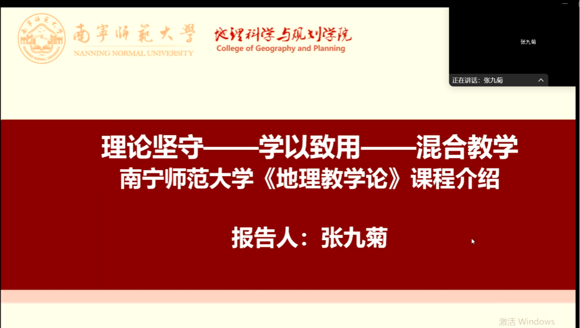南宁师范大学张九菊老师以《“理论坚守—学以致用—混合教学”:南宁师范大学地理教学论课程建设经验交流》为主题,分享了地理教学论课程的建设经验。报告以地理教师教育课程群能力图谱为指导,介绍了南宁师范大学地理教师教育课程群,然后重点以地理教学论课程为例,详细介绍了课程从校级到区级再到国家级的建设历程,以及课程目标、内容、实施、评价等方面的特色与创新。这些经验对于其他高校提升地理教学论课程质量具有重要的借鉴意义。