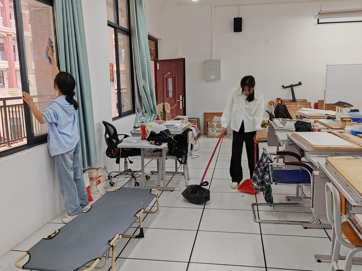 活动伊始,党员同志自行携带劳动工具到达指定教室,党员同志们分工协作、各司其职,有条不紊地整理桌椅、清扫地面、擦拭门窗,将教室清洁干净。