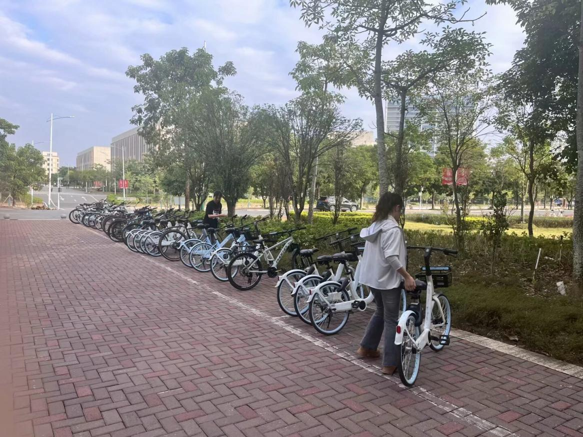 在党日活动中,全体支部党员以党小组为单位,党小组组长为小组负责人,将武鸣校区二号教学楼、地信楼、地源楼、武鸣校区一号教学楼周边校园道路上的共享单车摆放整齐并清理车筐内的垃圾。
