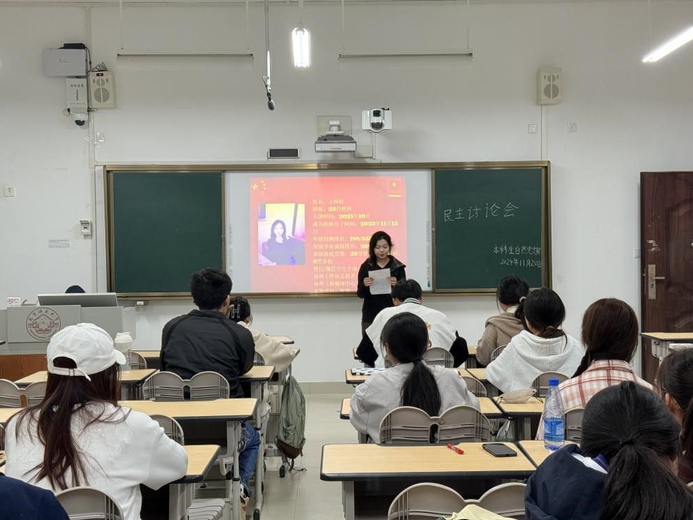 11月25日,必威西汉姆联本科生自然党支部于武鸣校区一号教学楼301教室召开民主讨论会,讨论阮晓沄等6位同志的入党事宜。会议由本科生自然党支部宣传委员王梓阳同志主持,支部全体党员、预备党员以及入党积极分子参与会议。