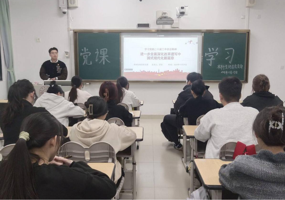 2024年11月29日,必威西汉姆联本科生地信党支部于武鸣校区一号教学楼301教室召开了以“学习党的二十届三中全会精神,进一步全面深化改革谱写中国式现代化新篇章”为主题的党课。会议由罗岩同志主持,支部全体党员参会。