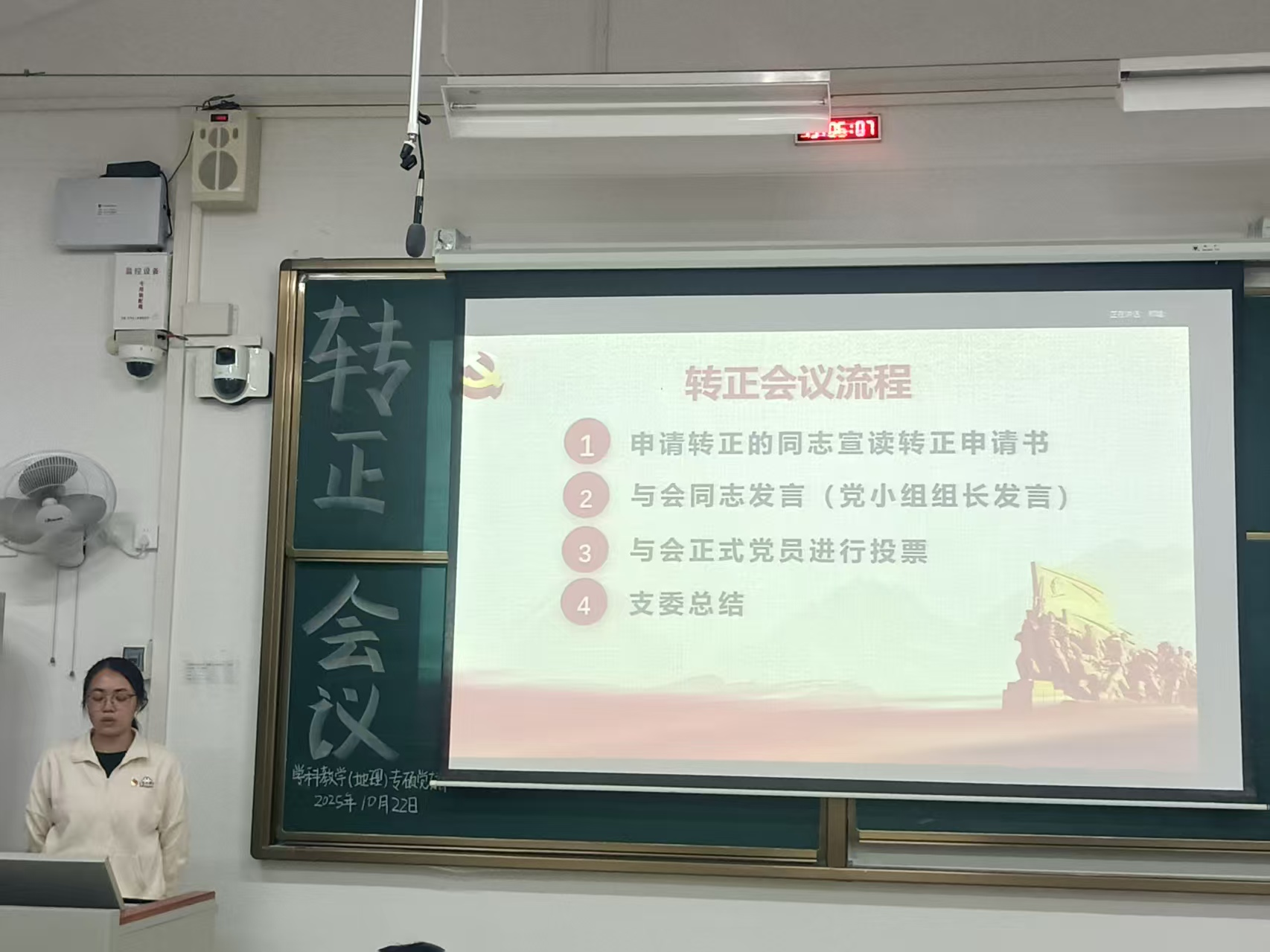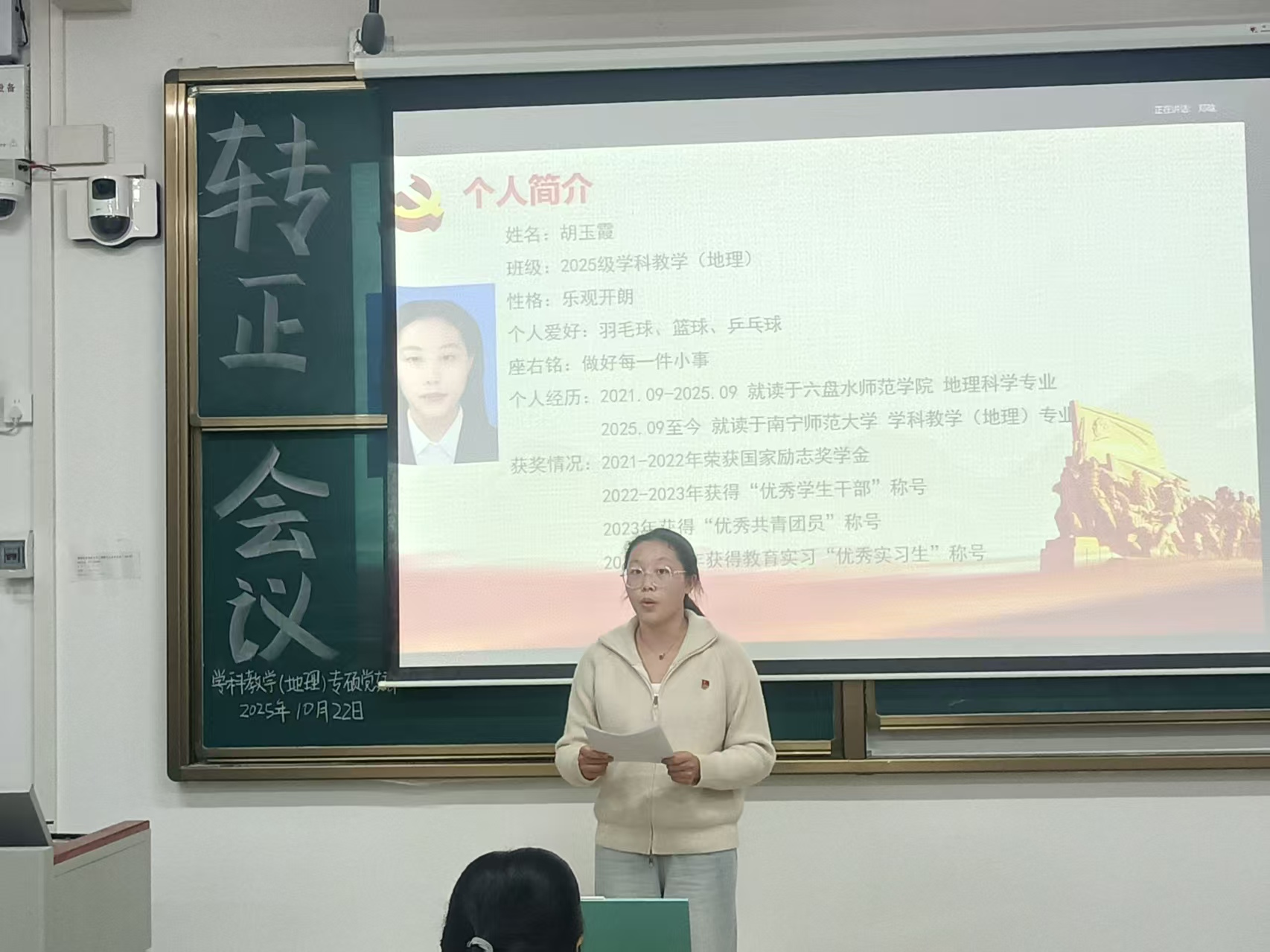 10月22日,南宁师范大学必威西汉姆联学科教学(地理)专业硕士党支部党员大会在武鸣校区一号教学楼412教室召开,主要讨论并审议胡玉霞同志预备党员转正事宜。支部应到会有表决权党员45名,实到会有表决权党员44名,符合规定人数。大会由组织委员黄小同志主持。