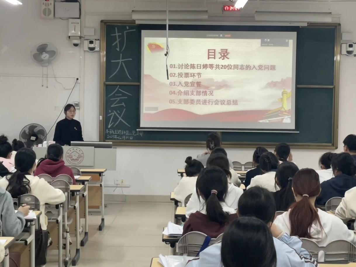 此次扩大会议围绕是否接收陈日婷等20位发展对象为中共预备党员进行讨论。会议伊始,发展对象依次宣读入党志愿书,阐述入党决心及理论学习情况。接着,各入党介绍人宣读介绍意见,与会正式党员充分讨论后,以无记名投票进行表决,最终一致同意接收陈日婷等20位发展对象为中共预备党员。随后,在谭秋莹同志的带领下,新预备党员进行了入党宣誓。紧接着,纪检委员覃韦梅对新预备党员表示祝贺并强调了党支部纪律要求,希望大家严格遵守党支部内的各项规章制度。最后,党支部书记冼晶晶对新预备党员表示祝贺并提出期望,鼓励大家充分发挥党员的先锋模范作用,以实际行动践行入党初心。