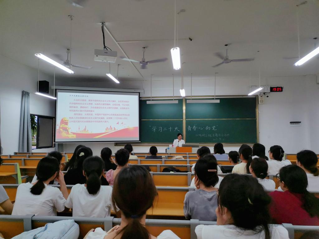 活动伊始,团支书杨聪敏对党的二十大报告做了全面的阐述,使同学们对党的各项方针政策有了进一步的了解,对国家未来的发展方向和人才需求有了更清晰的认识。在党团知识竞答环节中,同学们踊跃参与,以极快的速度正确回答问题,展现了良好的精神面貌和知识储备。随后,全体同学一起观看电影《建党伟业》,了解中国共产党的光辉历程,感受老一辈革命家不畏牺牲的爱国热情。最后,李渝颖同学分享了感悟。她表示当代青年生逢其时,重任在肩,作为新时代的青年团员需坚定不移听党话、跟党走,怀抱梦想,脚踏实地。